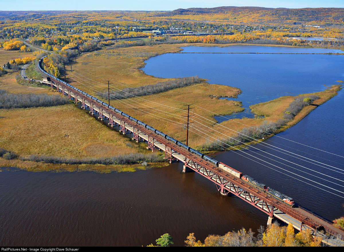 A view from a helicopter looking down on the former DM&IR double-deck Oliver Bridge spanning the St. Louis River in far western Duluth as a helper set shoves M343 towards Steelton Hill.