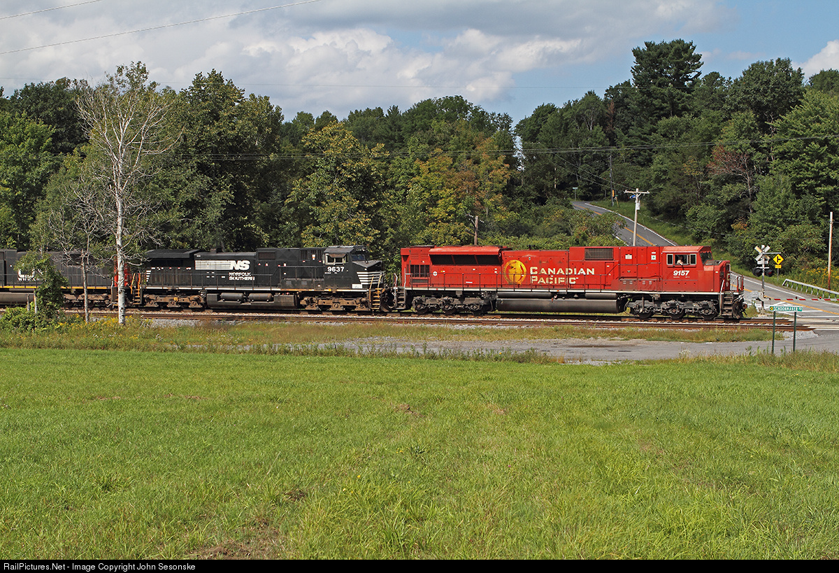One of the better looking reactivated CP SD90MAC's rolls the NS Enola to Montreal mixed freight NB on the old D&H. The 43 car trackage rights train is just about to cross Youngs Road 17 miles south of Schenectady with a CP-NS-CN-NS power set. The CP SD90MAC is running as an NS leased unit.