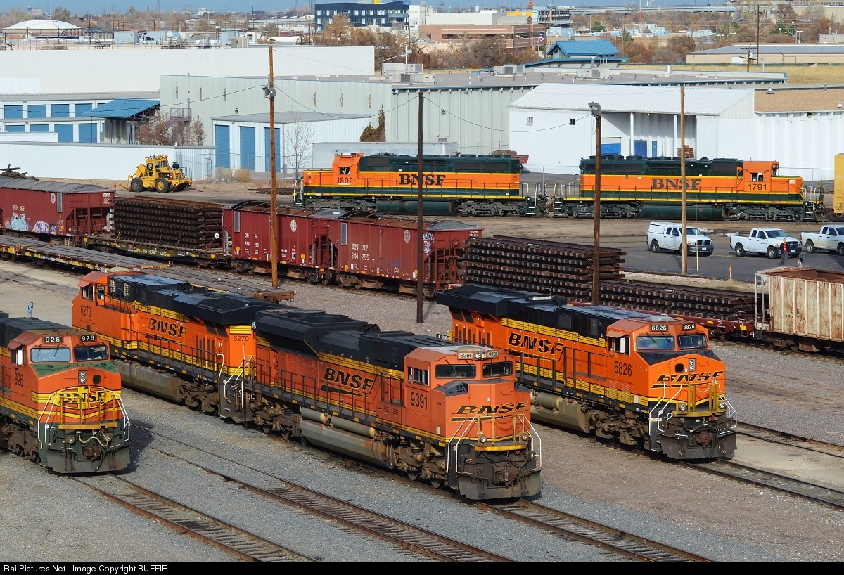 BNSF 9391 (SD70ACe) and BNSF 6270 (ES44AC), flanked by BNSF 6826 (ES44C4) and BNSF 926 (C40-8W), wait for orders to head to the Denver Yard. Meanwhile, BNSF 1982 and 1791 (both SD40-2's) bring yet more freight cars to the yard.