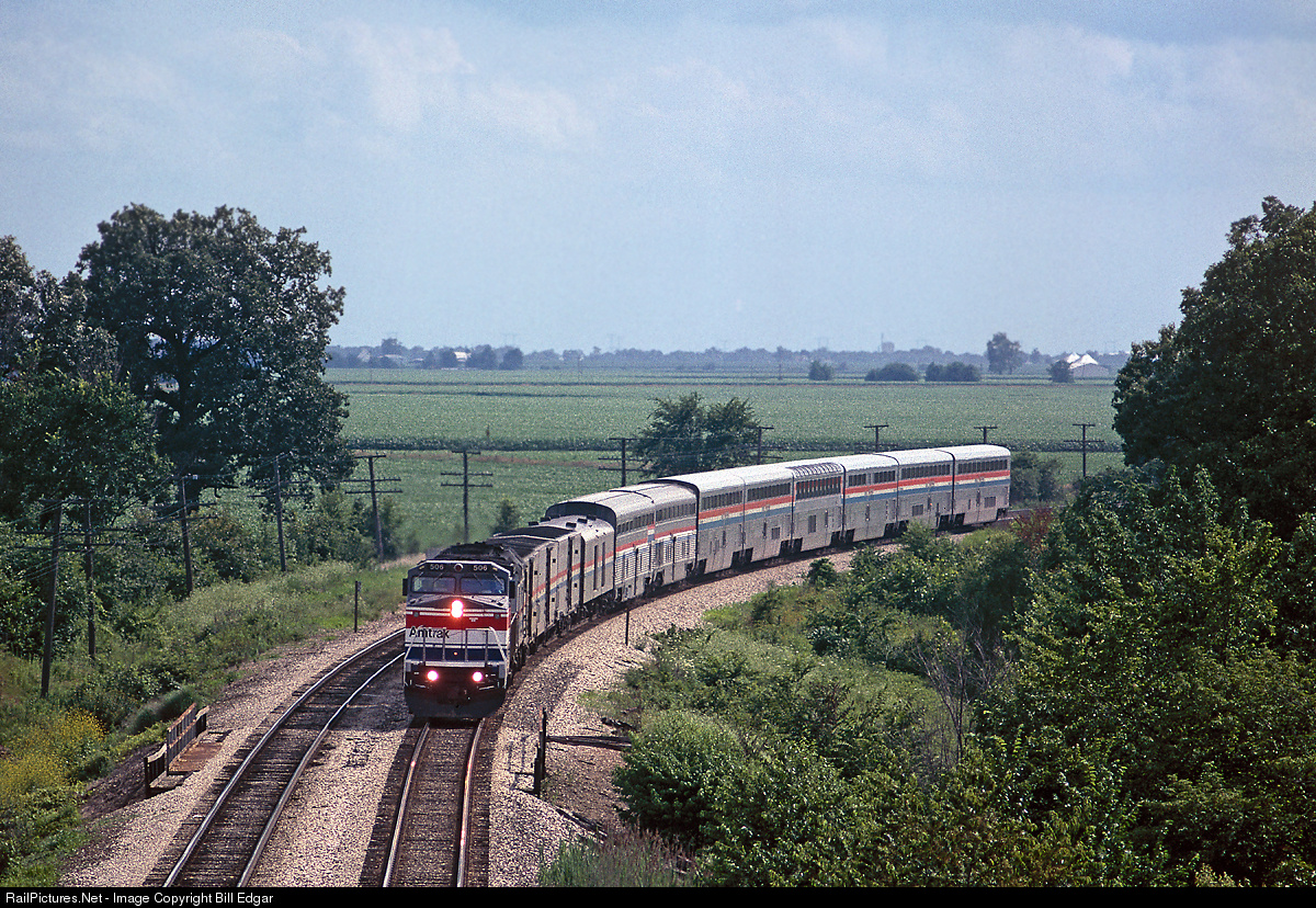 | Amtrak's Southwest Chief rounds a curve just southwest of Streator, Illinois behind then new "Pepsi Can" GEs. During this period Amtrak trains carried express mail/freight on western transcontinental trains. Note the first two high level cars are Budd Santa Fe vintage. |