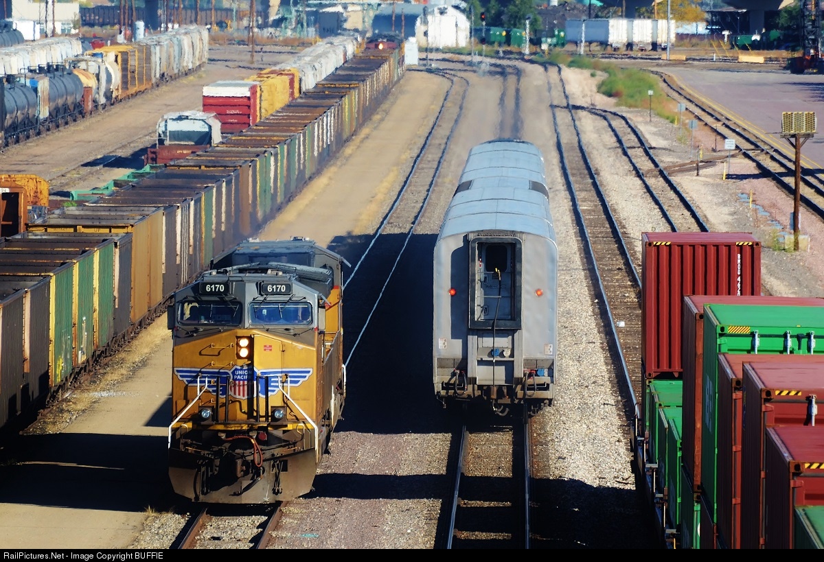 UP 6170 (AC4400CW) heading in for service after dropping off a mixed freight is passed by the morning Amtrak train heading to California.