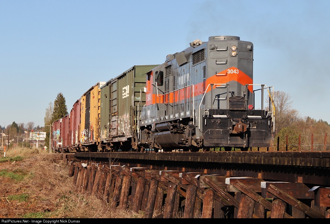 | WRIX 3043 to the rescue!!! After the Eastside Freight Railroad's SW1200 had been down for almost two months, this EMD GP20u finally came to the rescue from Western Rail in Spokane, WA. They were busy for the next few days getting the delayed loads to the customers. It sure is a nice sight to see a bigger locomotive on the ex-BN Woodinville Sub again. Here they are seen moving southbound, leaving Snohomish Junction. |