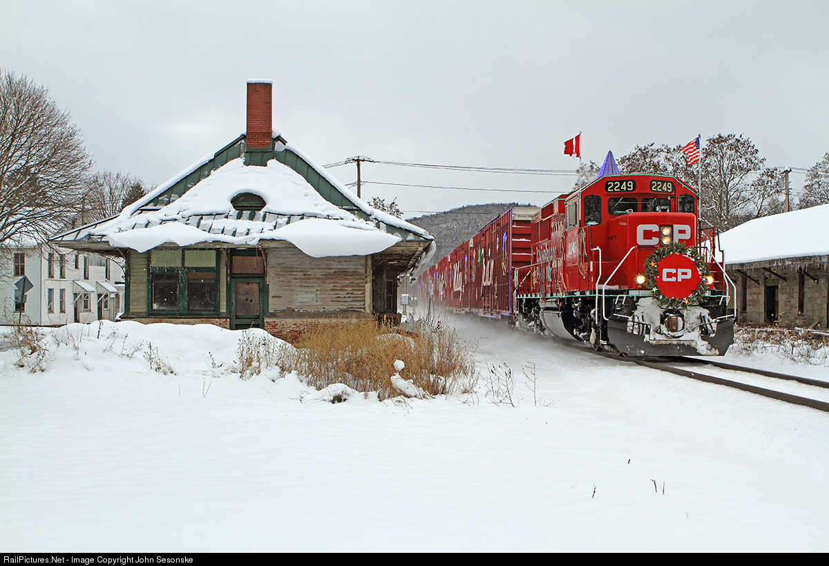 CP's 2014 Holiday Train threads its way between the former D&H passenger and freight stations in Unadilla as it makes its way NB from Binghamton to it's first stop in Oneonta. These tracks will belong to Norfolk Southern by mid 2015 so this is likely the last run for CP's Holiday Train past these historic D&H structures.