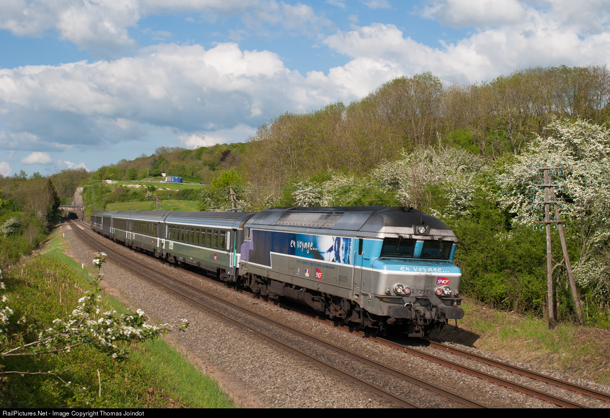 | Telegraph masts, loco-hauled trains, old diesels... The line stretch between Culmont-Chalindrey and Belfort still shows the image of the traditional railway, at least for a few remaining time... IC 1848 runs towards Paris and passes at Coulevon near Vesoul. |
