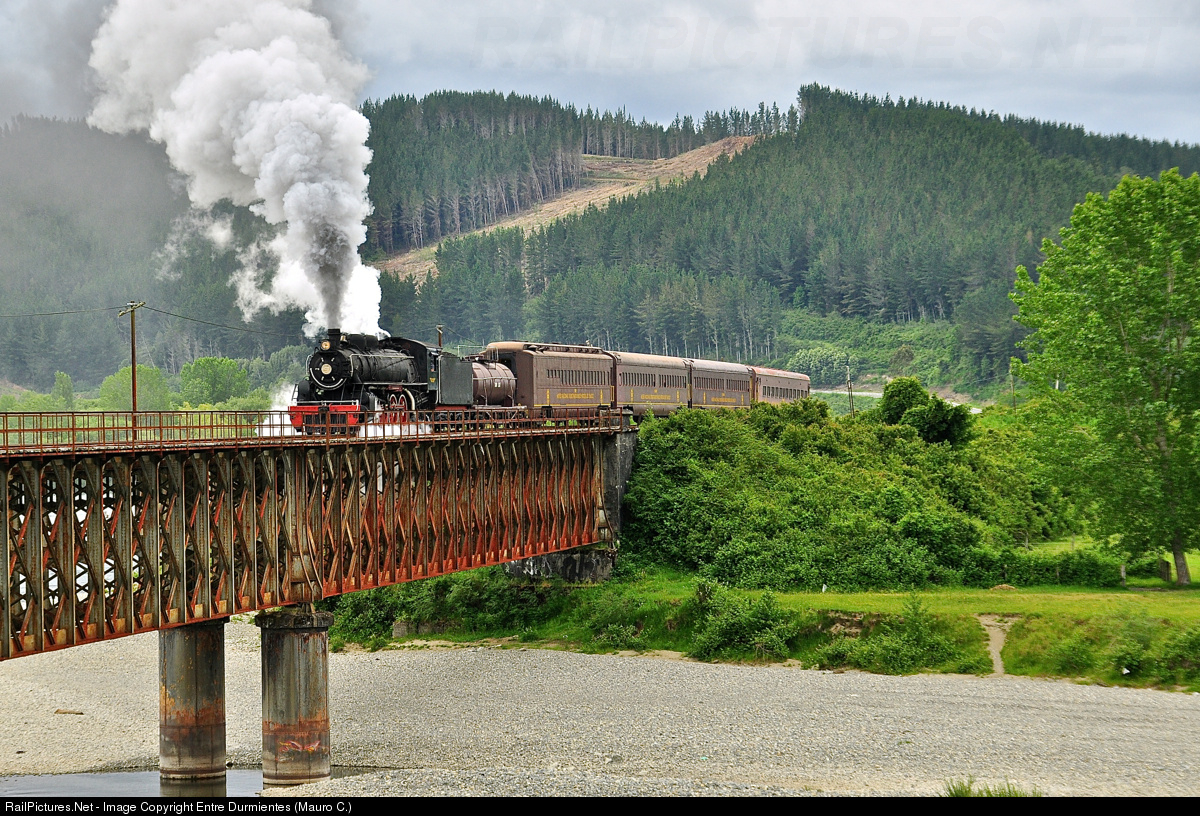 | Crossing the Calle Calle bridge, the "Tren de la AraucanÃa" travels from Antilhue to Temuco, with the steam locomotive 4-8-2 No. 820 built in 1940 by Baldwin Locomotive Works, on special service for The Railway Touring Company with european and north american railfans tourist. |