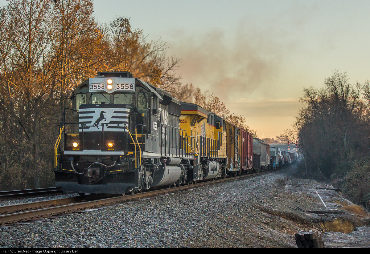 | A herd of train traffic came into Gainesville, GA all at once, but thankfully that worked in my favor as it gave the sun time to rise a little for a shot. NS 119 stopped to let 203 go around him and would also wait on 204 to cross over infront of him before the dispatcher released 119 to head South towards Atlanta, GA. |