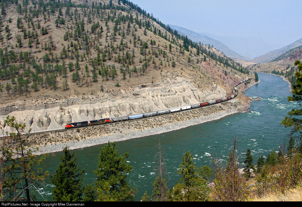 Canadian National train No. 843 snakes along the Thompson River between Spences Bridge and Seddall, British Columbia, on July 16, 2014.