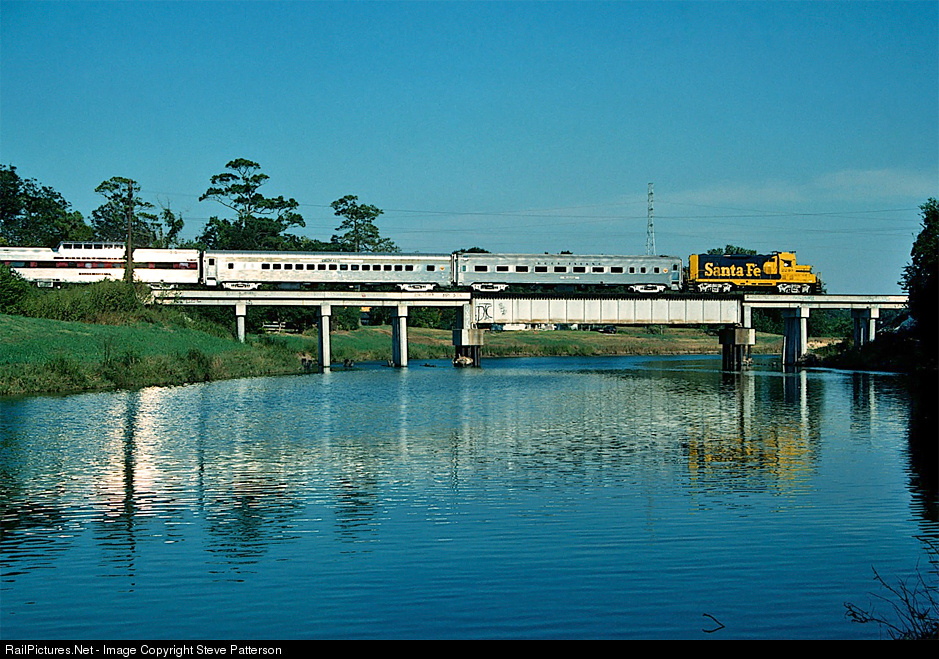 In Sept. 1989 some enterprising Houston businessmen began operating “The Texas Limited” about 4 days per week between Houston and Galveston on the SP. The following month, Oct. 14, 1989, the southbound train was crossing a bayou at Harrisburg, Texas with leased ATSF Geep 2240 as their own F unit was in the shop. The first car was ex-CRI&P named “Michelob;” 2nd car was ex-ATSF Chimayo” built for the Super Chief in 1937, and 3rd car was an ex-CB&Q dome coach from the Calif. Zephyr, lettered for the Roaring Fork Ry.