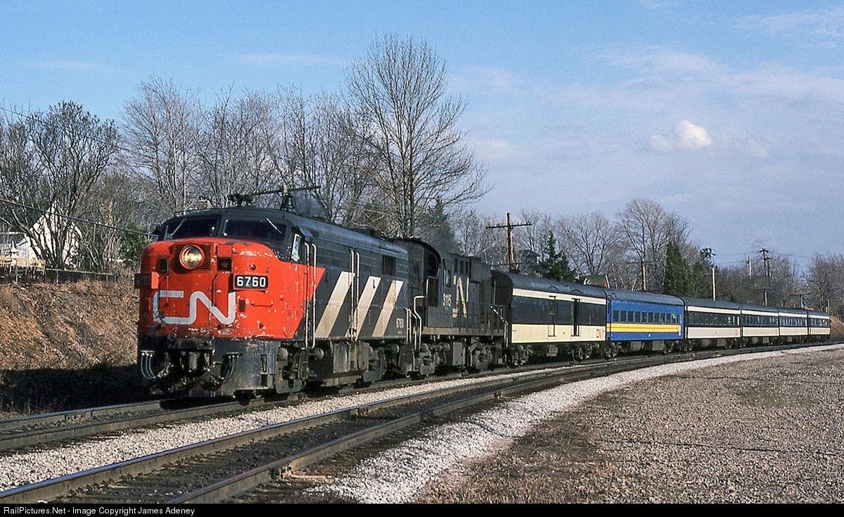 FPA-4 6764 and RS18 3115 are in charge of this westbound with only a hint of VIA in the consist. The paint's looking a little ratty, but the machinery inside is well maintained by CN shop forces, and still up to the demands of daily passenger service.