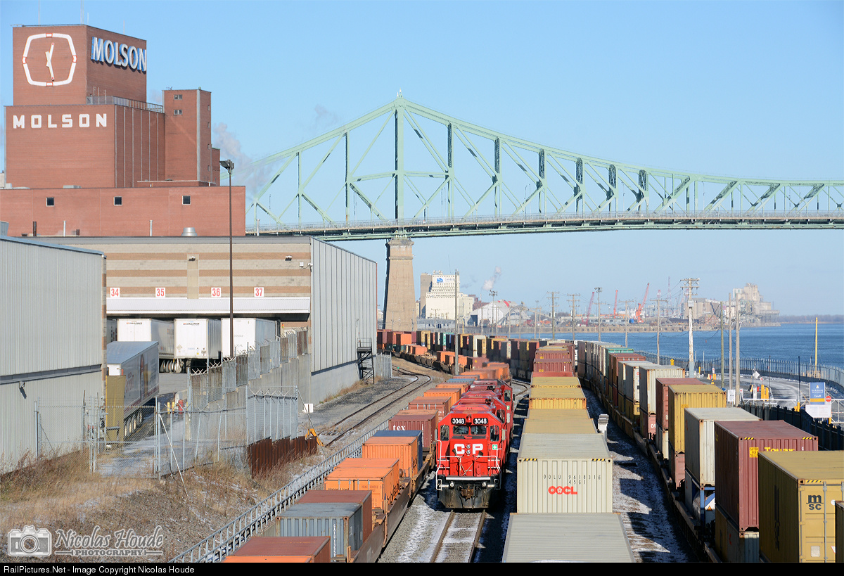 By a gorgeous afternoon, the CP switcher gets in the Port of Montreal to do the interchange between CP and Port of Montreal. You can also see the brewery Molson on the left, under the Jacques-Cartier bridge, and a part of the the Saint-Lawrence river.