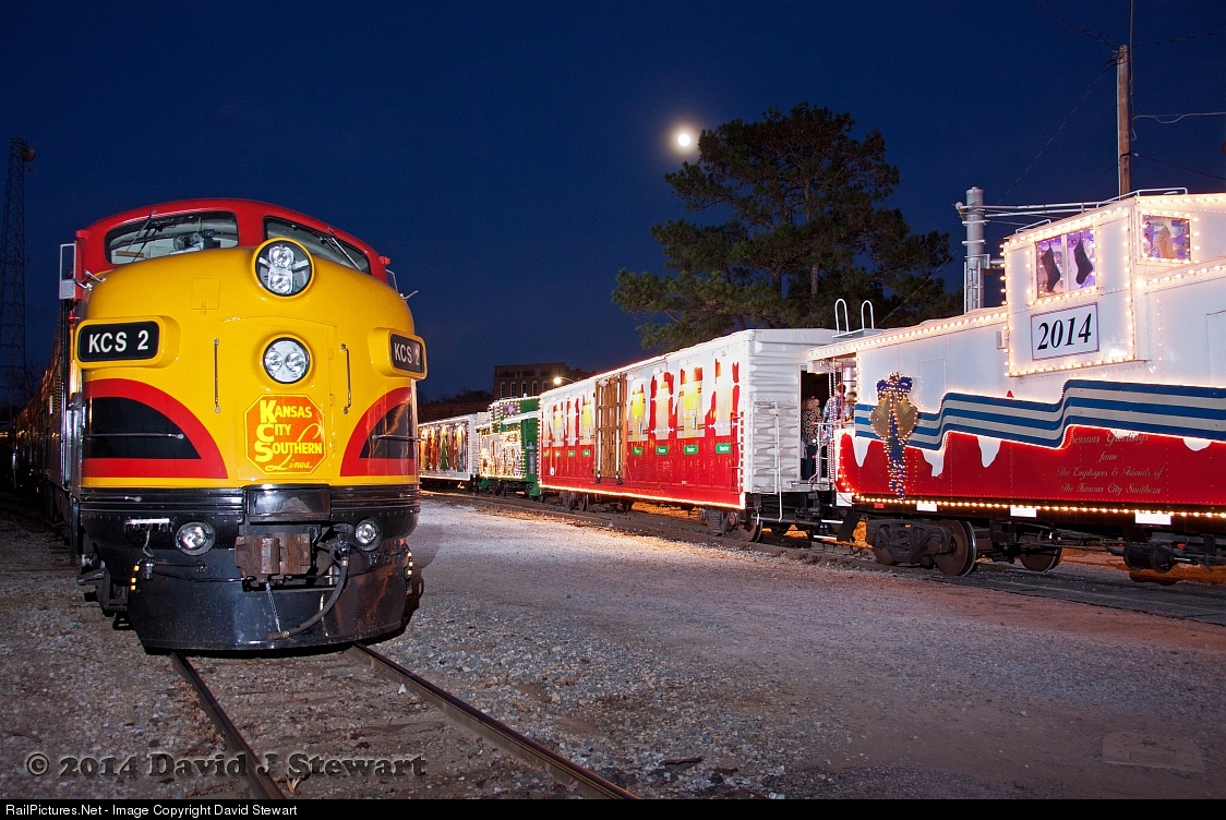 Kansas City Southern's Holiday Express stands in downtown Newton, Ms on the evening of December 4,2014 during the opening of the train's public access. The train has brought out record number crowds this season and reminds us that the Holiday Spirit is still alive and well throughout small town America. Many thanks to the hard work, dedication and willingness of the KCS team for once again bringing this tradition to life. The carrier's set of flawless EMD FP9s add the corporate image to the train during the month long tour. Be sure to check KCS's website for scheduling and information. http://www.kcsouthern.com/en-us/AboutKCS/Documents/2014/2014_Holiday_Express_Schedule.pdf