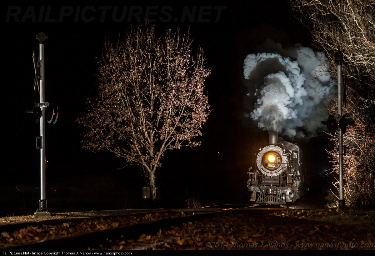 | Valley Railroad Mikado No. 3025 leads a North Pole Express out of the shadows nearing the Dock Road crossing in Chester, Connecticut |