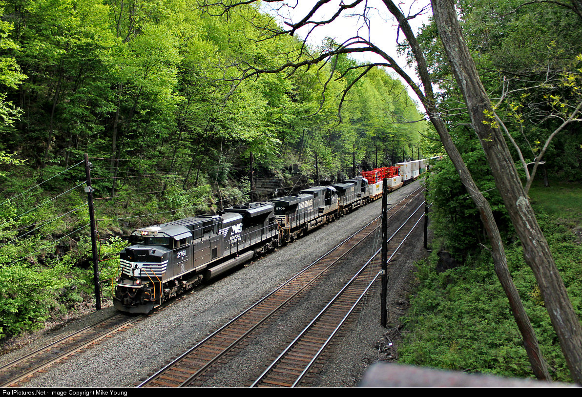 | Going back to spring 2014, we spent a long weekend on the NS Pittsburgh line during memorial day weekend and the action was very good, in this shot NS train 26T is thundering up hill through Cassandra with a EMD SD70M-2 in charge. |