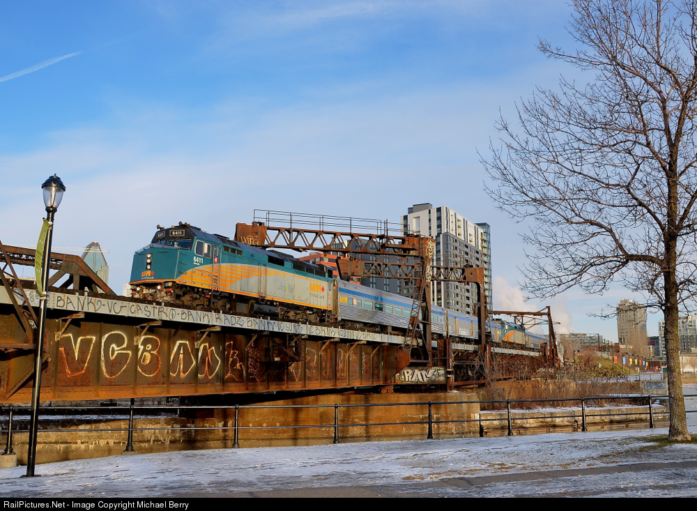 | F40's head-end and mid-train. VIA 601/603 with VIA 6411 leading and VIA 6413 mid-train is crossing the Lachine canal in Montreal on a cold morning. The train will remain combined until Hervey Junction where the two trains go their separate ways (Jonquière and Senneterre respectively). |