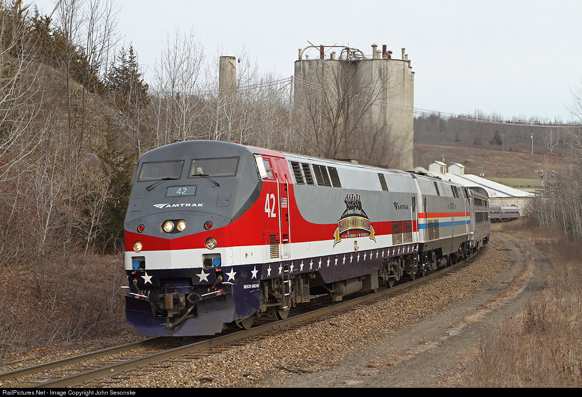 | The Amtrak Veterans unit is paired with the Phase III AMTK 822 to haul 10 Amtrak cars from Rensselaer to Binghamton. The train is rolling SB past the former cement plant at Howes Cave on the D&H. This was a deadhead move to position the train for the annual Toys For Tots train from Binghamton to Rouses Point on 12-6 and 12-7. Car consist was Viewliner Theater Observation in Phase IV "American View", Heritage full dome in Phase III "Ocean View", Amfleet lounge/café in phase IV, Amfleet coach in phase IV, Heritage baggage car in phase IV, Heritage baggage car in phase IV, Heritage baggage car in phase IV, Heritage sleeper in Phase III "Pacific Bend", Heritage sleeper in Phase IV "Pacific Cape", Amfleet Business Car in phase IV "Beech Grove".