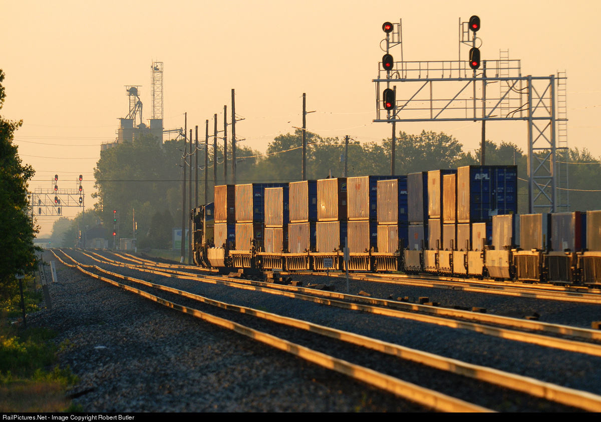 The first golden rays of the sunrise catch an eastbound stack train departing the CSX container facility.