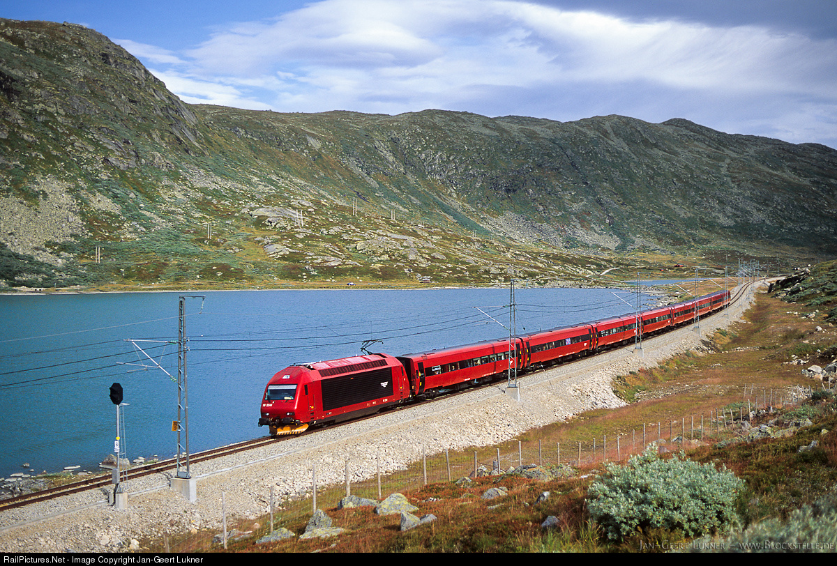 | Expresstrain 601 crosses Hardangervidda mountain area on norwegian Bergen line. Between Tunga and Finse the train runs along lake Storurdi. |