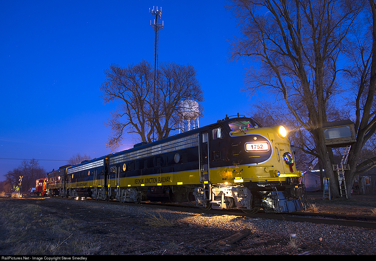 Keokuk Junction's spotless set of F units stand with repainted caboose PREX 3 at Cuba, Illinois on December 6, 2014. Children are telling Santa wishes, while engineer Tom Black waits to depart for the last stop at Smithfield, Illinois.