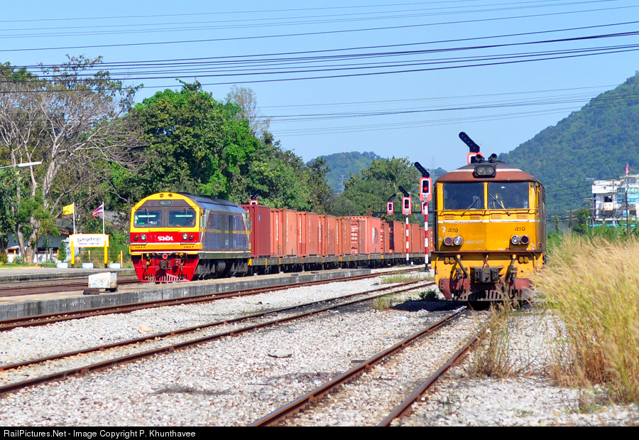 Container freight train from inland container depot at Lat Krabang to Laem Chabang Port with 30 bogie container flat wagons.