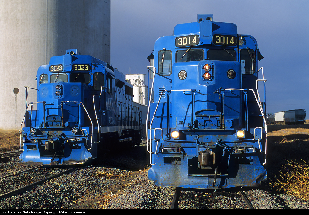Two bright blue Cimarron Valley Railroad EMD GP30s sit outside the railroad’s three-stall engine shop at Satanta, Kansas, on the morning of March 1, 2000. At the time, CVR had an all-GP30 locomotive roster, including these two former Rio Grande locomotives still in their same road numbers.