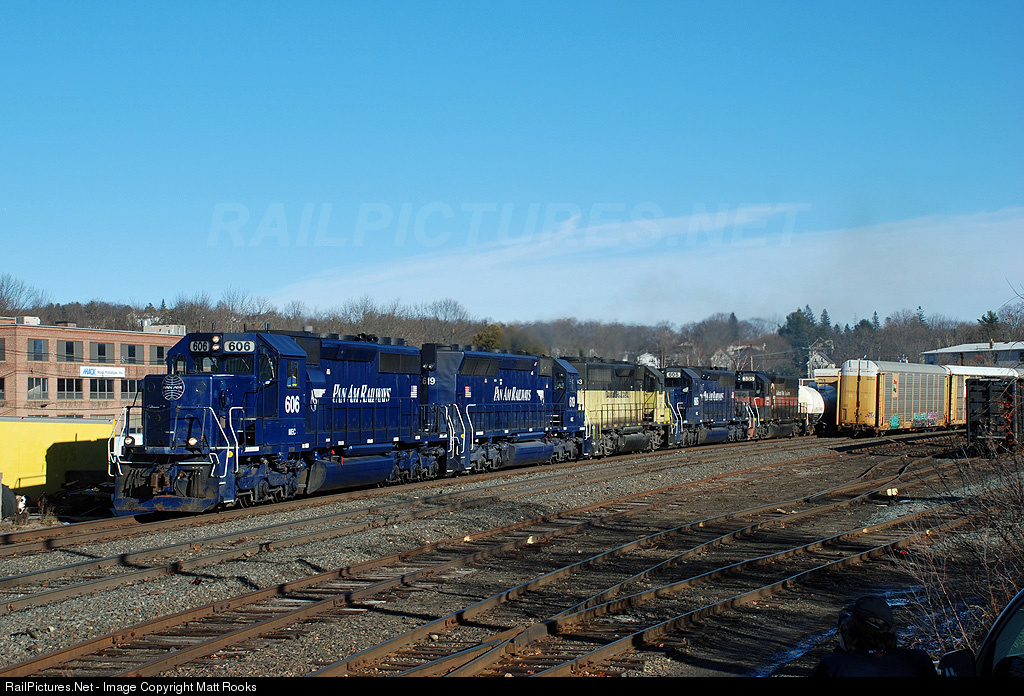 Westbound freight POED (Portland, ME - East Deerfield, MA) rolls through Gardner Yard where Pan Am and P&W interchange cars. Power for this westbound was: MEC 606, MEC 619, GMTX 3003, MEC 605, BM 335 and 81 cars.