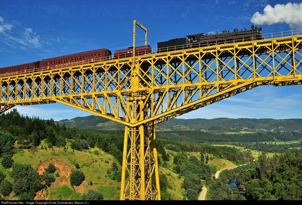 The Malleco Viaduct, with its 103 meters high, and 124 years of life continues to give us great moments, its 348 meters long with nobility supporting the passage of heavy freight trains, or nobly go have emotive formations as this tourist and heritage train. Is the "Tren de la AraucanÃa", with the steam locomotive Mountain No. 820 (built in 1940 by Baldwin Locomotive Works), on special service with european and north american railfan tourists of railway touring company, on the last journey of four days.