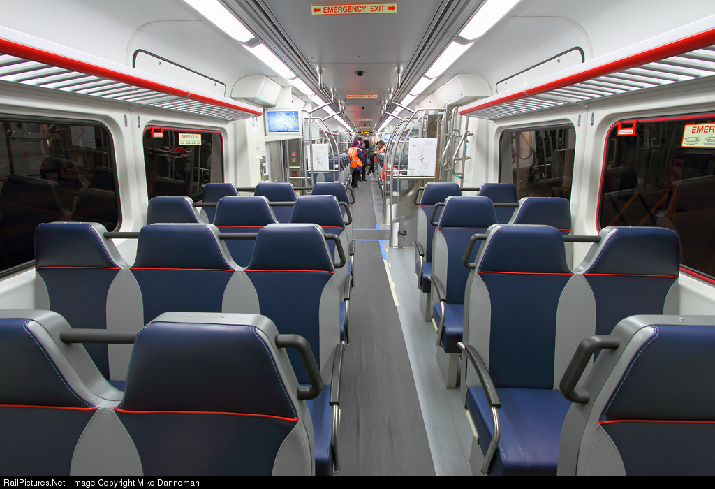 An interior view of Denver’s Regional Transportation District new electric multiple unit commuter rail cars that will run on four FasTracks rail lines currently under construction. The first four cars were shipped from Hyundai Rotem’s plant in Philadelphia to Denver and were put on display and open for tours at Denver Union Station on December 3-6. RTD has purchased 66 cars to serve the East Rail Line to Denver International Airport, the Northwest Rail Line to Westminster, the Gold Line to Arvada/Wheat Ridge, and the North Metro Rail Line to Thornton. The steel car shells were manufactured at Hyundai Rotem’s plant in South Korea, then shipped to the company’s plant in Philadelphia for final assembly. Each car seats 91 passengers with luggage storage, bike racks, and level boarding for easy access, like wheelchairs, strollers and rolling luggage to the airport.