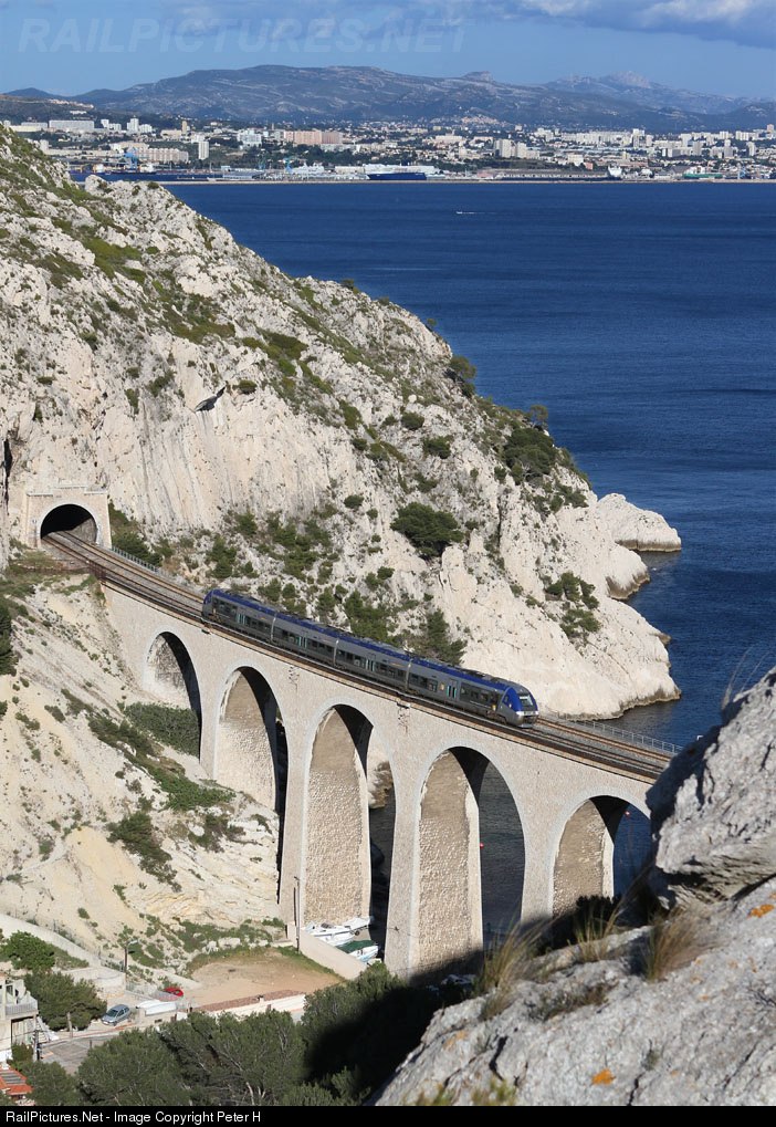 The 'Ligne Bleu' (Blue Line) runs from Marseille to Miramas most of the time along the shore of the Mediterranean Sea. Many tunnels and Bridges were necessary to build the line - for us photographers many occasions to do great shots. Here a B 81500 DMU is heading as TER879747 towards Marseille which is visible in the distance.