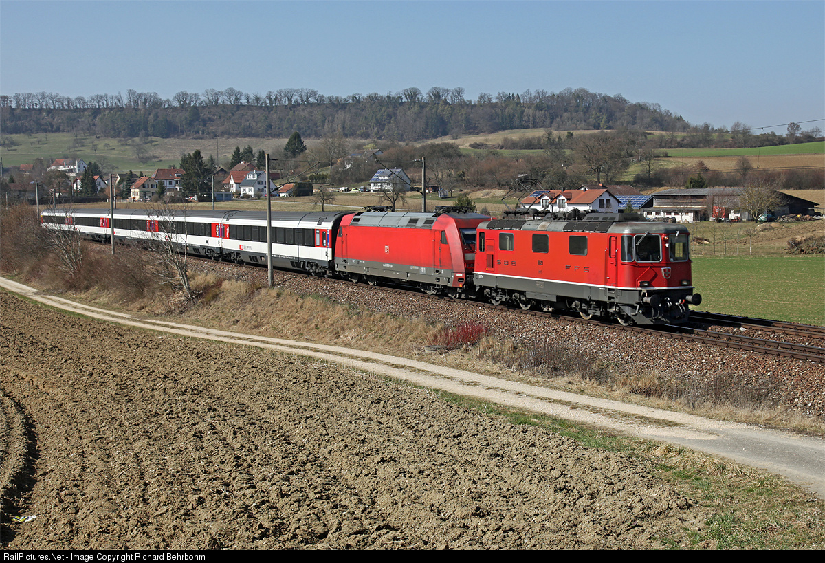 | With Intercity 186 the Swiss Re 4/4 II is pulling the damaged German locomotive 101 095 to Singen (Hohentwiel).