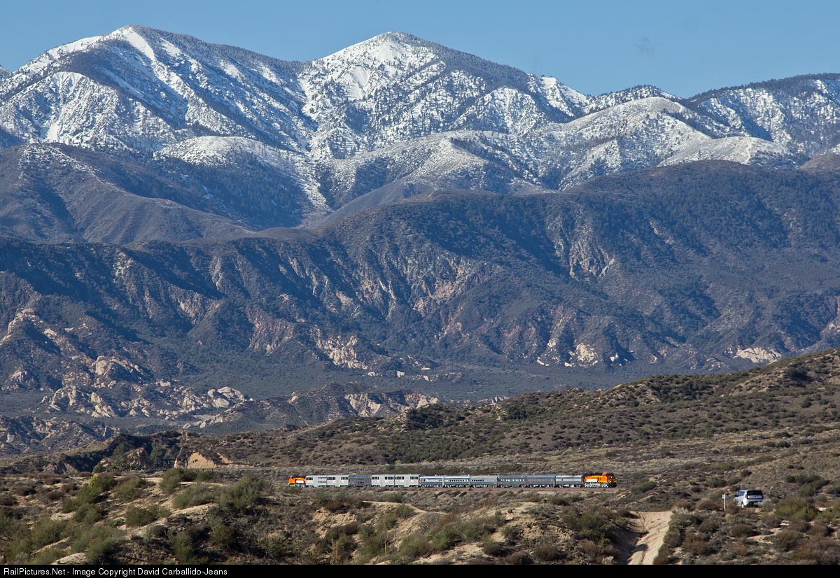 | After a harsh rain storm hit Southern California, the San Gabriel Mountain Range finally had a good amount of snow on them. Which made for a perfect view inside of the BNSF California Division Christmas Train BNSF puts on every year. The eleven car train was making its first of two trips up Cajon Pass that day, caring 500 local children from the Boys & Girls Club and local children hospitals. |