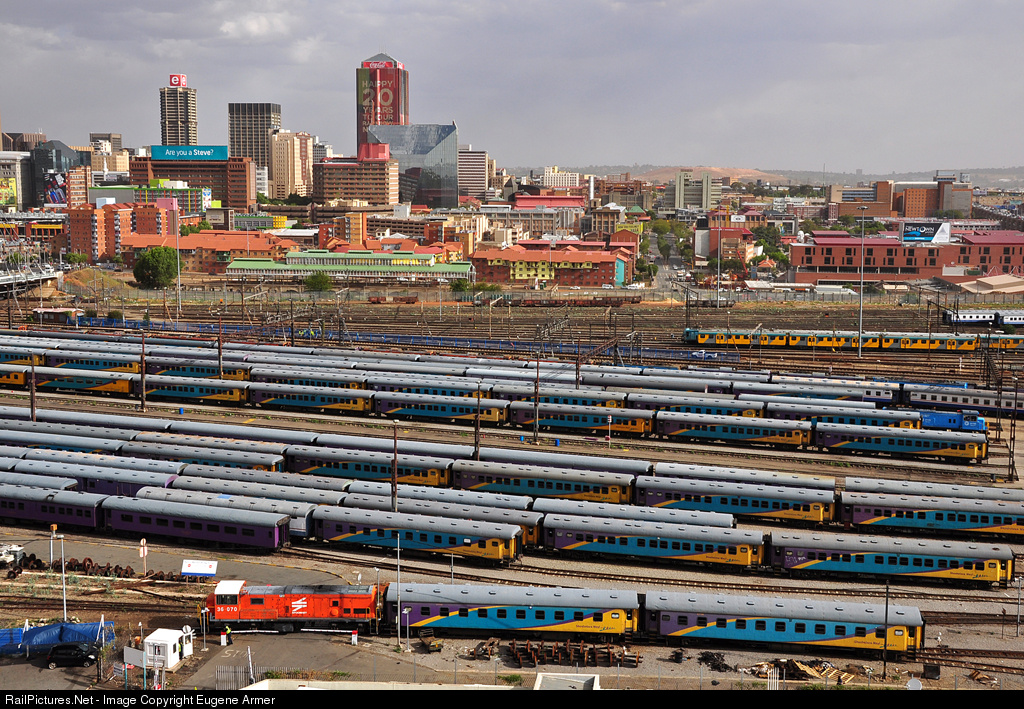 A view from Braamfontein looking south over the Braamfontein North Passenger Yard in the foreground, the South Yard where the Metrorail EMU's are staged, and beyond that the district of Newtown in downtown Johannesburg. The North Yard in the immediate foreground is where PRASA (Passenger Rail Agency of South Africa) long distance passenger trains are made up and serviced. These days it looks more like a storage yard, with curtailed train services the order of the day, largely due to a fleet of equipment that has hardly seen any new additions in many years. The majority of the passenger coaches are in the "Shosholoza Meyl" livery, but some of the purple Premier Classe equipment can also be seen. A class 36 GE type SG10B diesel shunter in orange Spoornet livery is shunting a couple of passenger coaches on the nearest track. On the extreme right of the picture, another class 36 in the blue PRASA livery is visible, as well as some passenger coaches in the old MLPS (Mainline Passenger Services) blue & grey livery.