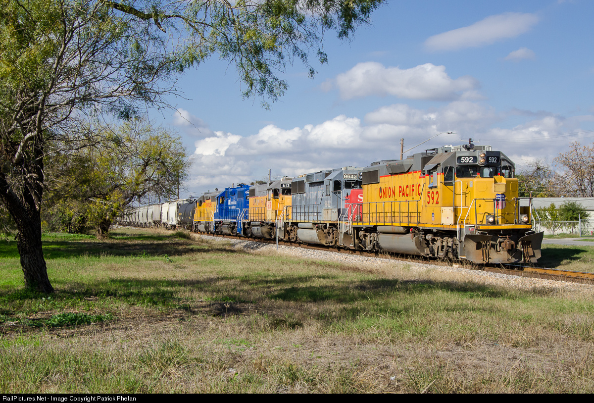| GPapalooza as I call it. UP's Rockport Sub local accelerates south along S Presa St. with five GPs of various lineages including one of the few remaining unpatched Cotton Belt GP60s. The train is heavy with frac sand loads for the industries at the very south end of the line, likely justifying this impressive lash-up of power. |