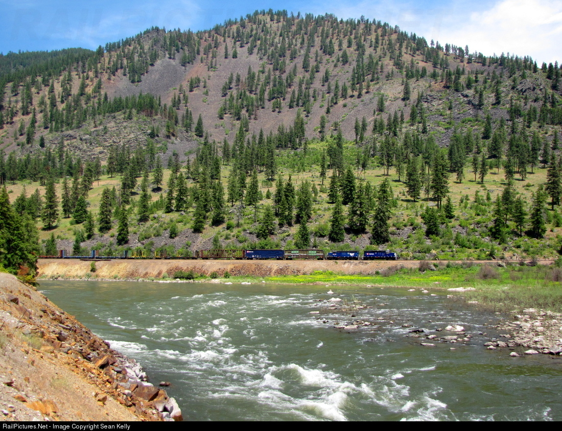 | The westbound Paradise Local rumbles downriver toward its home base with a string of empty lumber cars, passing some small rapids on the Clark Fork River near Quinns. |