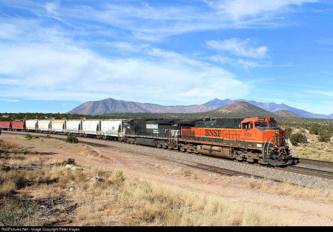 | A faded Heritage One BNSF Dash-9, along with an NS Dash-9 which is uncommon to the area, head east. They snake away from the San Francisco peaks sticking up to the sky next to Flagstaff. |