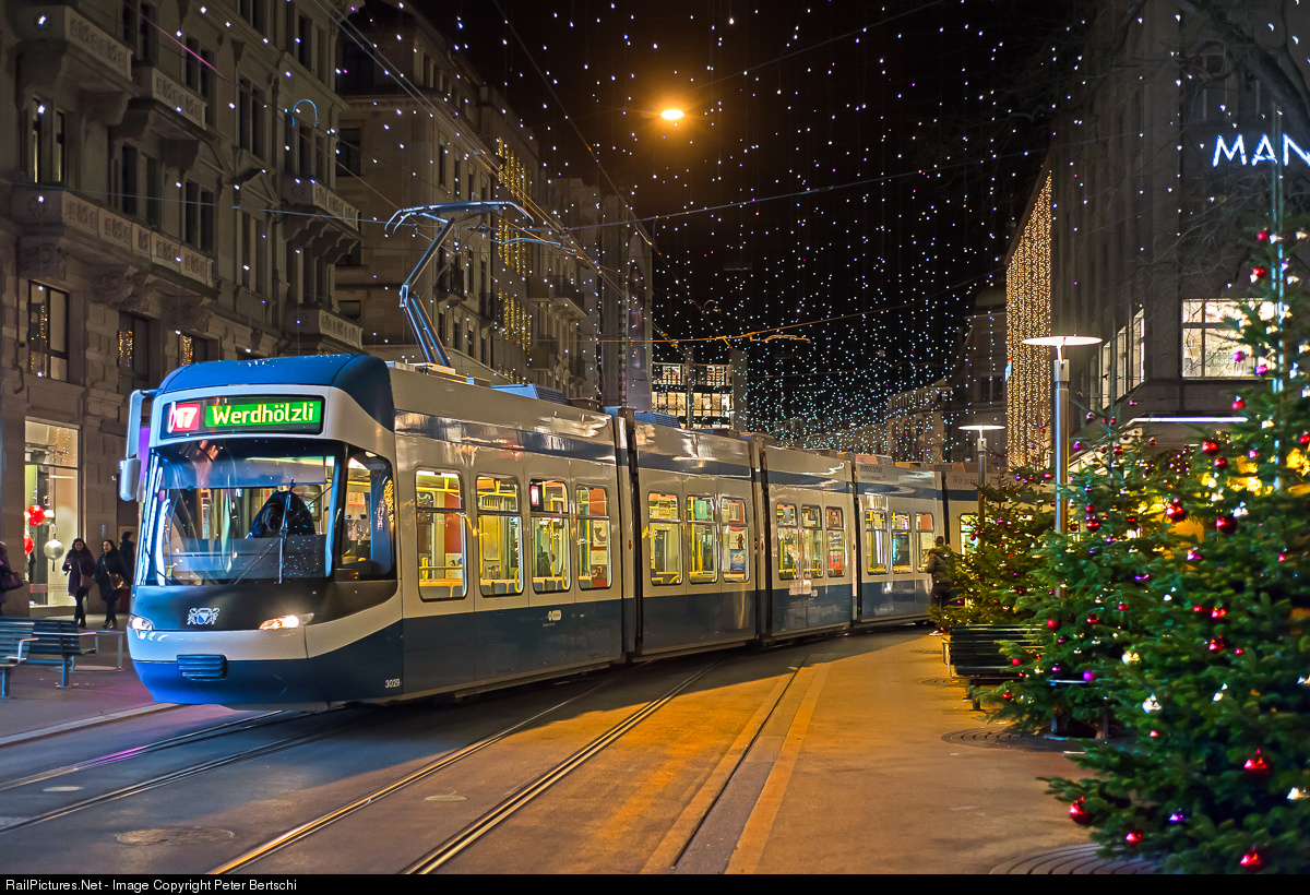 VBZ Tram Cobra No. 3029 is turning into the "Bahnhofstrasse". The Cobra was built in 2010 by Bombardier Transportation, Alstom and Alusuisse Road & Rail, design by Pininfarina and Scala Design.