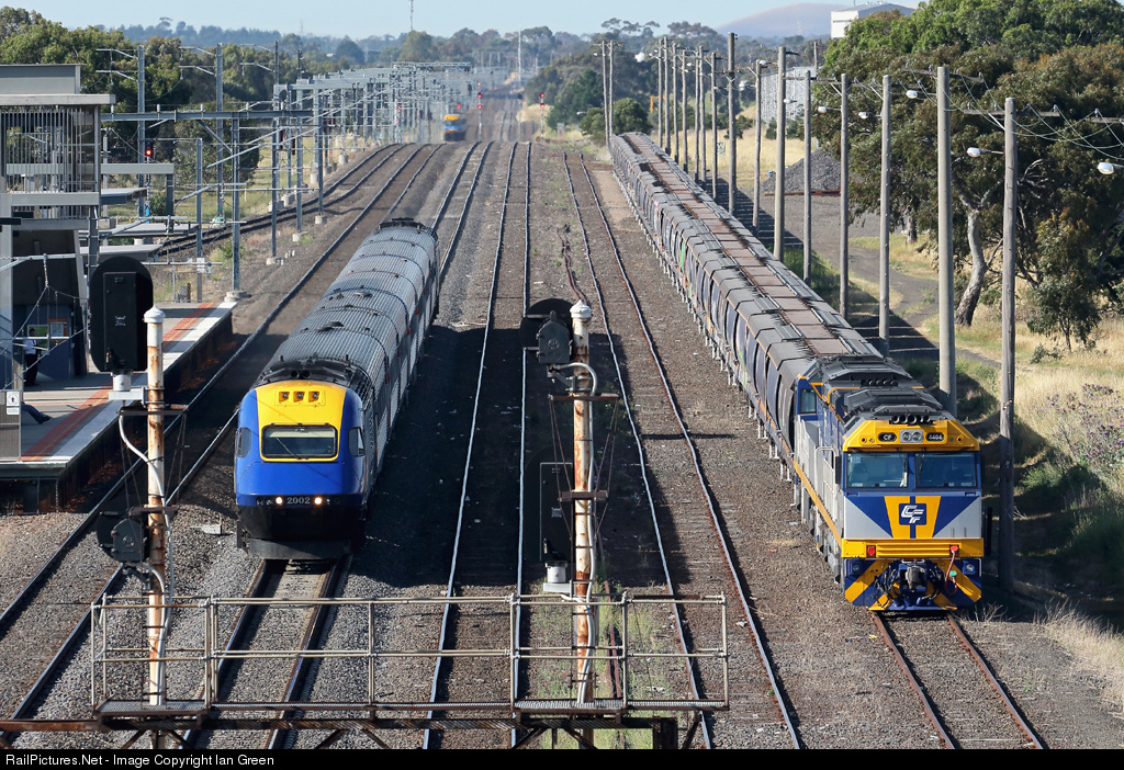 The Sydney to Melbourne XPT service runs past a stabled Qube grain led by CF4404-CF4402 at Somerton Loop.