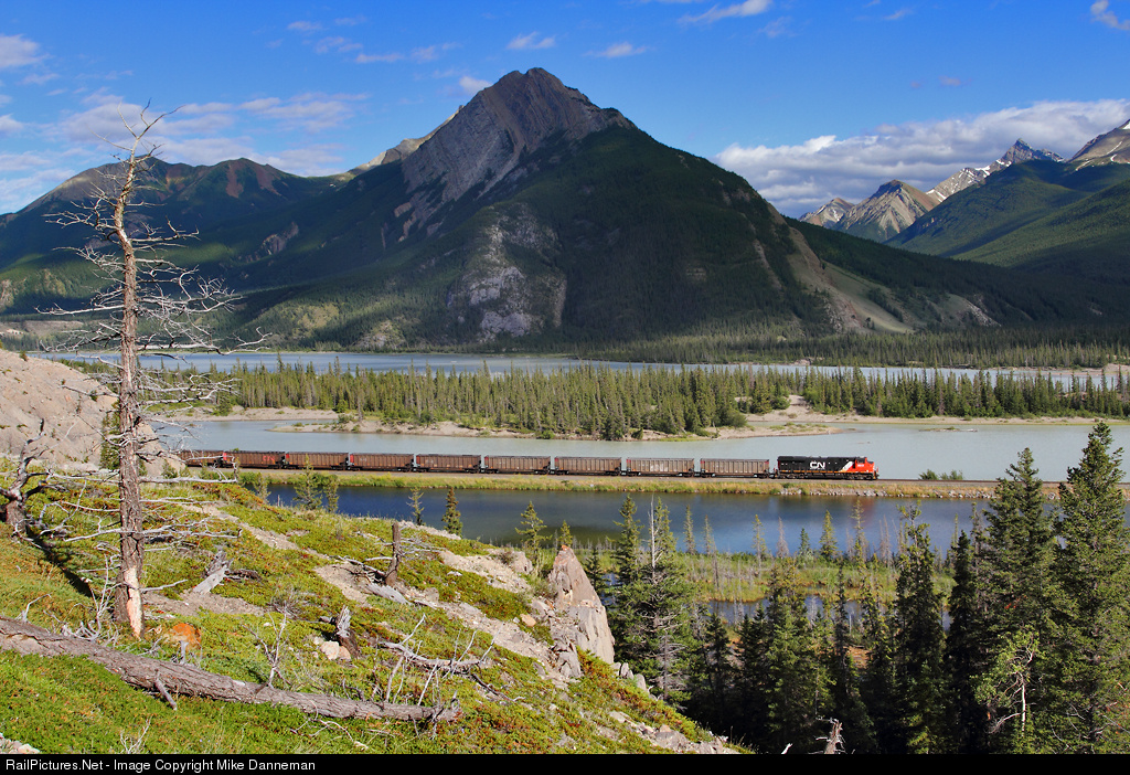 An eastbound Canadian National coal train passes Windy Point west of Devona, Alberta, on July 10, 2014. Two newer GE ES44ACs power the train, Nos. 2811 and 2813 in 1+1 (one on the point, the other on rear as DPU) formation. The scenic wonders of Jasper National Park surround this area on CN’s Edson Subdivision.