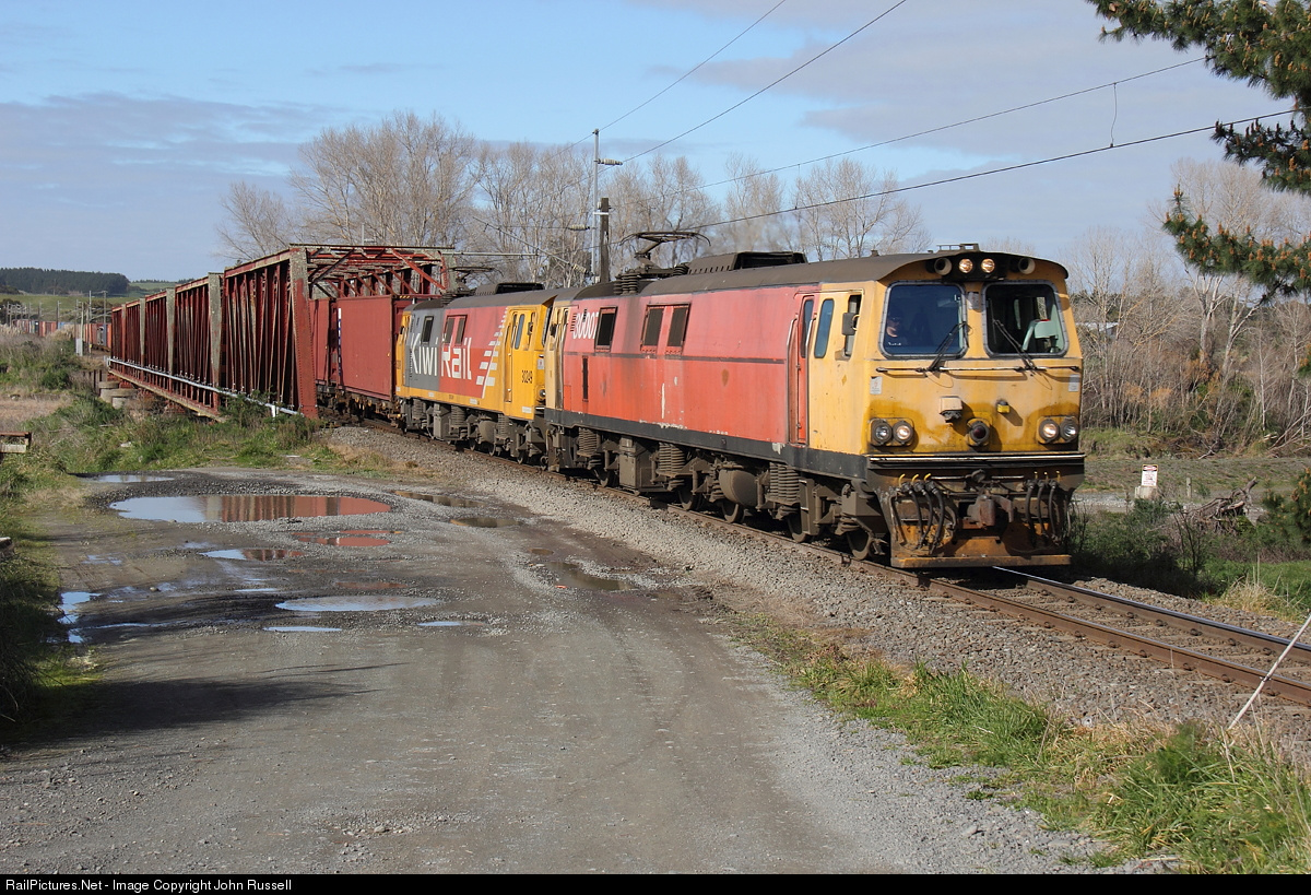 | EF 30007 is assisted by 30249 on manifest train 240 from Wellington to Auckland, seen near Marton crossing the Rangitikei River. This train will soon cross this river twice again but on viaducts over 250ft high! The EF class locomotives are the most powerful on KiwiRail network and were built in mid 1980's by Brush in UK. |