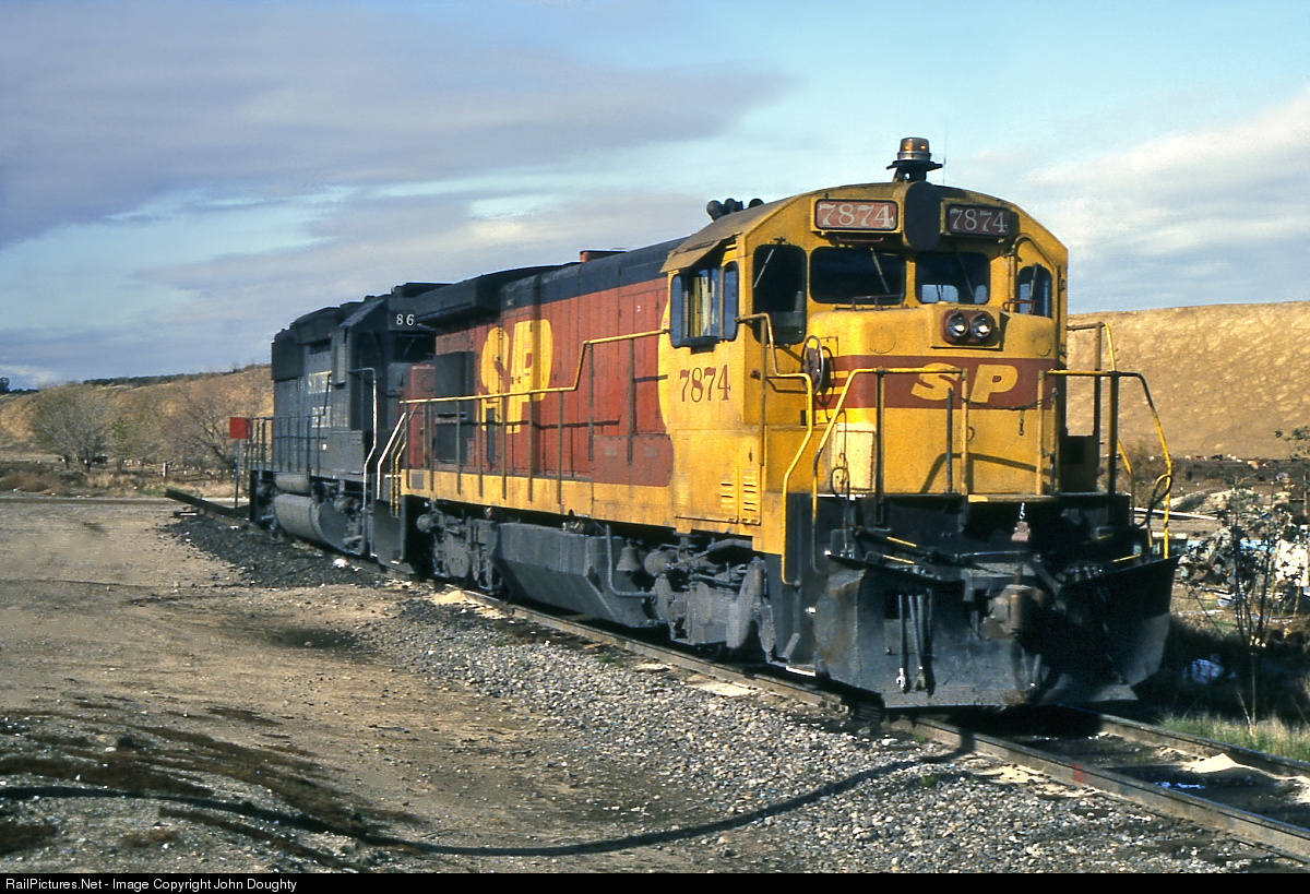 | SP 7874, sporting the SP- Santa Fe "kodachrome" merger paint scheme, sits at the spur track near the east switch at Bena. |