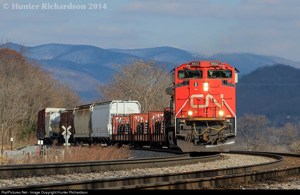 | As he sun breaks through the clouds in Shawsville, CN 8932 thunders upgrade as westbound manifest train 189 climbs Christiansburg Grade on the former Norfolk and Western. |