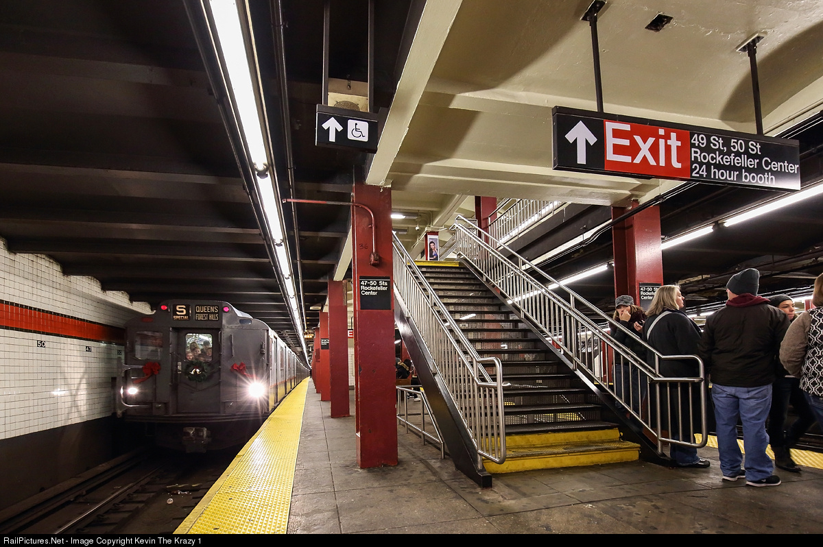The NYC Transit Nostalgia Holiday train arrives Rockefeller Center on its first trip of the day through the 6th Ave Subway. This marks the 10th year of the holiday train, this year running with a 8 car trainset of R1/9 cars built in the early 1930s. The lead car, #1575 was wrecked and rebuilt as a prototype with a much more modern interior.