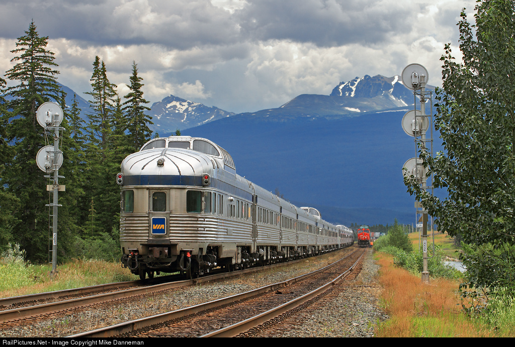 VIA Rail train No. 1, the westbound Canadian, flies through Henry House, Alberta, and meets eastbound Canadian National train No. 102 on July 19, 2013. Carrying the markers of the 21-car train is dome-observation car “Banff Park.”