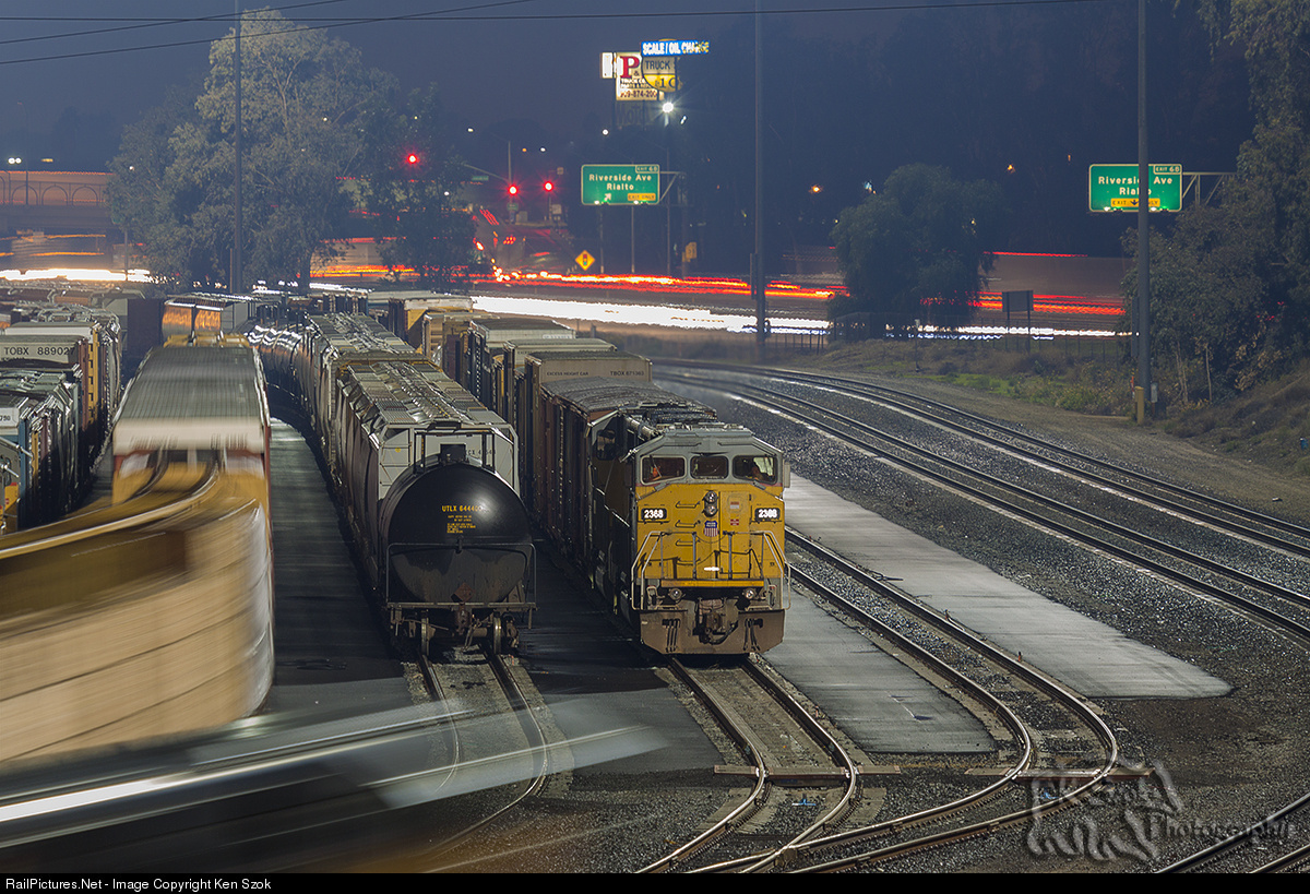 | The crew sitting in the cab of UP 2368 looks on as another train departs West Colton. The head end of the departing train has made its way around the balloon track and has just entered the lower left part of the image as the tail end of the same train has not yet cleared out of the yard track. |