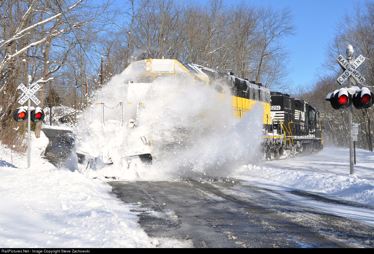 With nearly 10 inches of snow on the ground, the NYS&W decided to run light engines West from Ridgefield Park to clear the main all the way to Pelton. Having plenty of snow built up at grade crossings from the plow trucks allowed for shots like this to happen. Here we see a white-faced 3022 leading the "plow train" at Beaver Lake. |