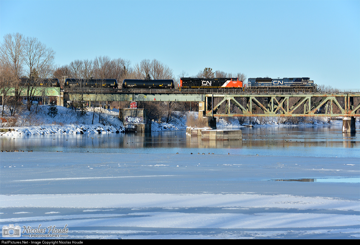| Under a sweet light, CN 704 pass over the Richelieu river with CN 8101 (one of the 4 EMD SD70ACe Demo acquired by CN in early 2014) in lead, and a brand new GE ES44AC CN 2904. |