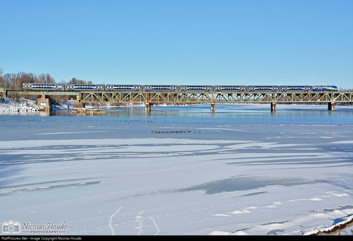 AMT 1362 (Bombardier ALP-45DP) pulls the AMT #808 over the Richelieu river at Otterburn Park, QC.