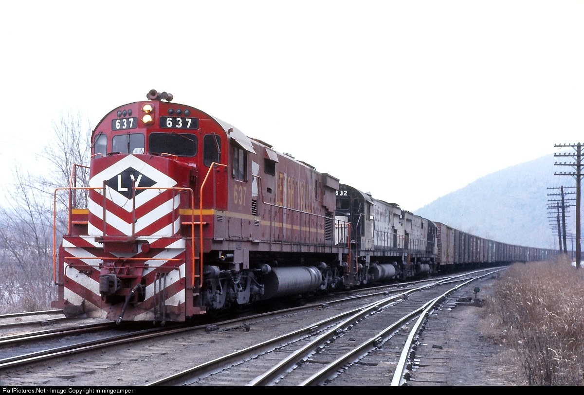 LV #637 leads a C628 trio on an eastbound at the north (RR west) end of Coxton Yard in Duryea, Pennsylvania. All those boxcars were probably picked up at the P&G paper mill in Mehoopany.