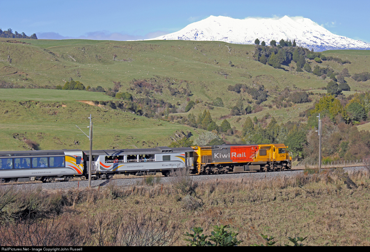 Trains on 3' 6" (1.067m) track from Whangarei to Bluff with virtually heritage rebuilt EMD and GE locomotives still the mainstay power. The network was privatized in 1990's and operated by Toll until 2008 when state owned KiwiRail was established.