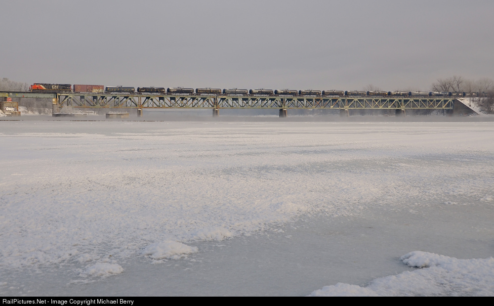 But it isn't. CN 2318 is at the head end of a quite late CN 305 (Moncton-Toronto) which is passing over the Richelieu river with quite a bit of tankers at the head end. CN 8816 is operating mid-train.