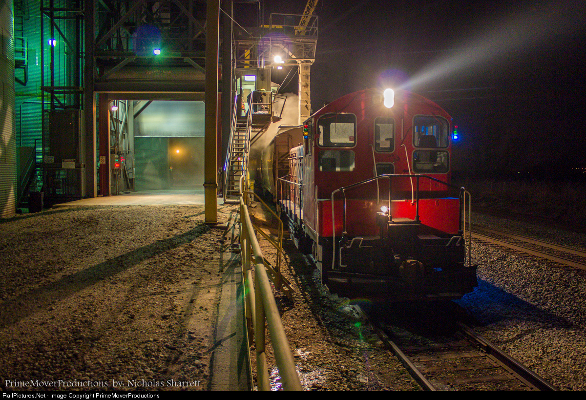 The crew at Valley Grain in Kingston Ohio work to load NS grain cars on a cold December evening. The EMD SW9 is remote control equipped and is operated by the worker controlling the flow of grain above. This ensures uniform and proper loading.